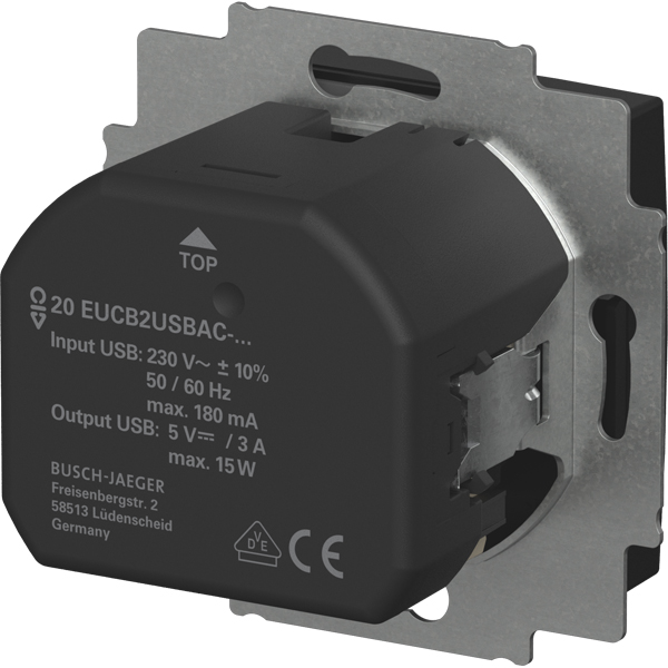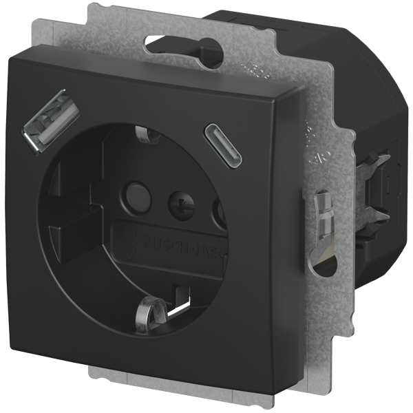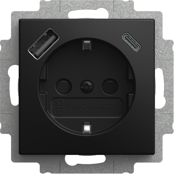 USB-Schuko-Steckdosen Einsatz Busch Jaeger 20 EUCB2USBAC-915 mit Kinderschutz in der Farbe schwarz matt für die Unterputz-Montage. Mit USB Typ A / C Steckbuchse zum Laden und Versorgen mobiler Endgeräte über USB-Kabel (Ladekabel nicht im Lieferumfang). Keine Datenübertragung möglich! Ein gleichzeitiges Laden via USB-Anschluss und Nutzung der SCHUKO Steckdose ist möglich.