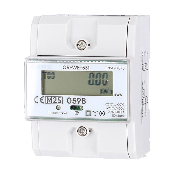 3-Phasen-Stromzähler ORNO OR-WE-531 MID. Drehstromzähler elektronisch 5(80)A, Breite 4,3 Teilungseinheiten mit Display, der Zähler mit MID-Zulassung. Genauigkeitsklasse B mit S0-Ausgang 1000 Impulse/kWh. Drehstromzähler mit LCD-Display mit blauer Hinterleuchtung, Reiheneinbaugerät für Montage auf Tragschiene DIN-EN 60715 TH35.